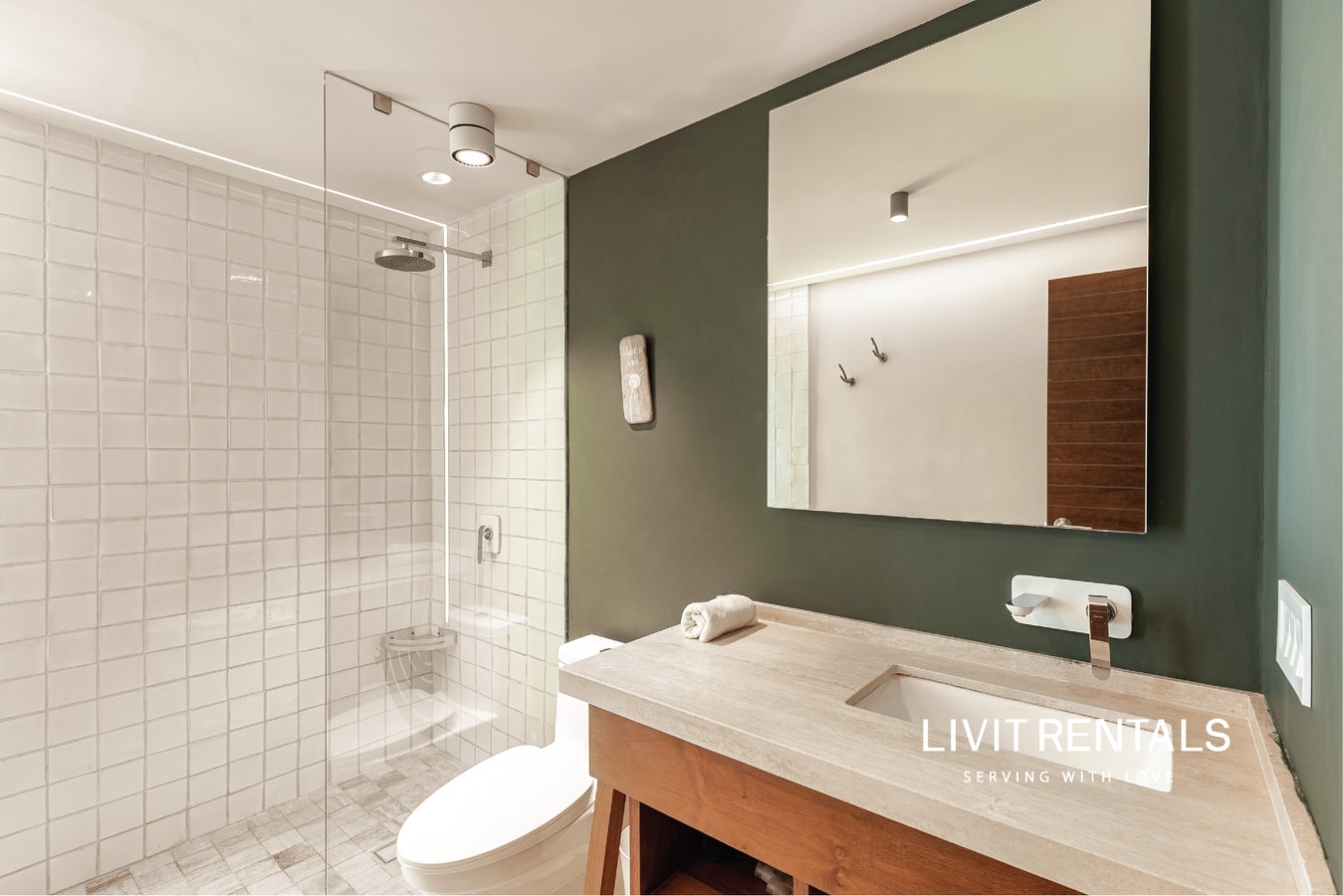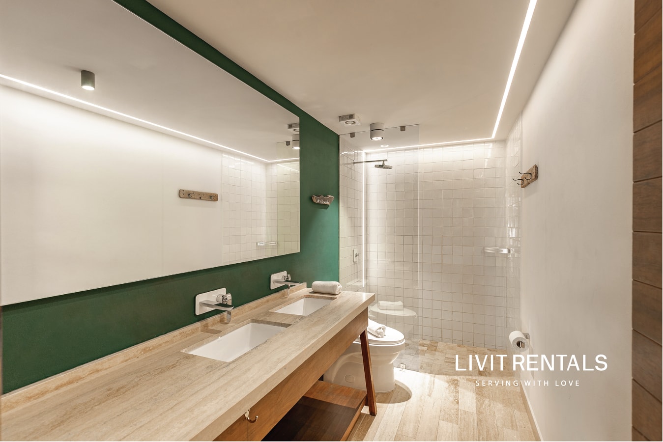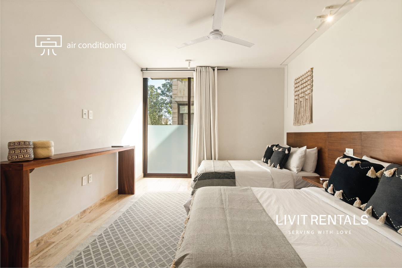 The apartment is beautiful, clean and spacious. Beds are comfortable and there is a bathroom in every room which was so convenient. It is located in one of the nicer neighborhoods in Tulum and there are plenty of restaurants, grocery stores near by. I was traveling with a group of 5 ladies and we felt very safe and comfortable in the building and apartment.