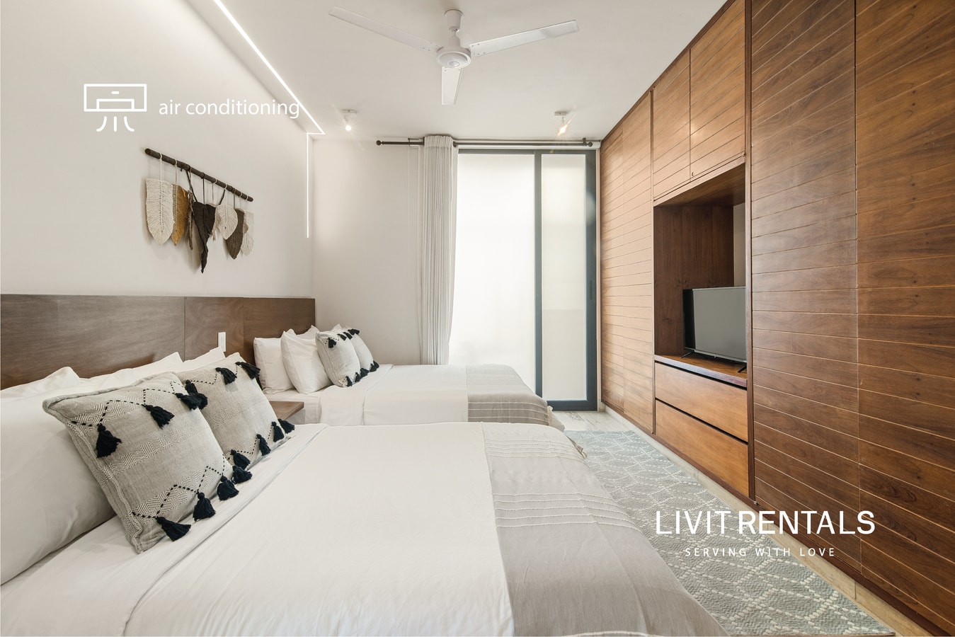 Absolutely loved our stay here. It was perfect for 6 of us! We spent most of our time hanging on the roof and in the private rooftop pool. What a beautiful rooftop and pool area. There was an AC in each room as well as the living room and they worked wonderfully. The place was clean and even nicer than the photos. Beds were comfy and we loved the rainfall shower heads in each bathroom. The staff at the property was wonderful and extremely helpful whenever we needed assistance. They have bikes for rent at the property as well. We loved biking into town to grab food. Safe and quiet area. So happy we stayed here!